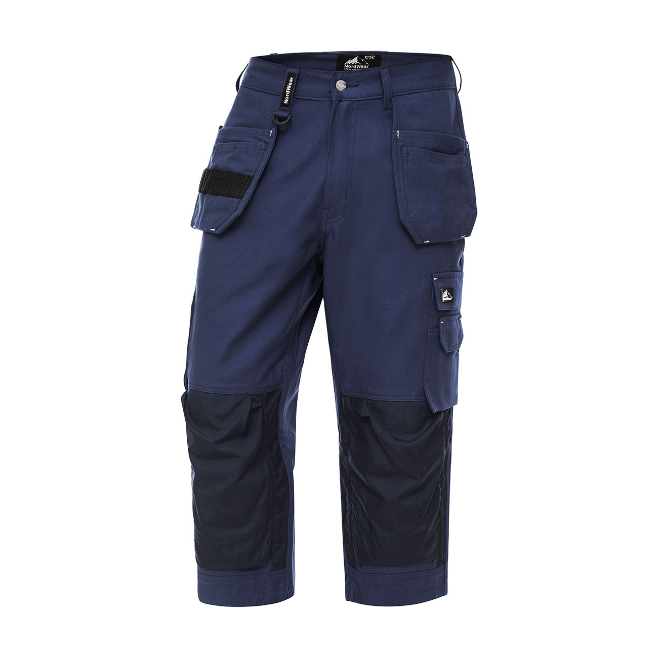 Nordwear craft trousers consist of two loosely hanging CORDURA®-reinforced nail pockets. Leg pocket with bellows, Mobile pocket, ID card pocket, Ruler pocket with bellows, double knife holder, Pen pocket, Two back pockets with bellows. CORDURA®-reinforced knee protection pockets, Two knee protection placements, YKK zippers, D-ring in front heel, and 2 hammer handles. Extendable legs (+ 5cm). A detachable ID card pocket (NW 9994) can be purchased as an accessory for this product.